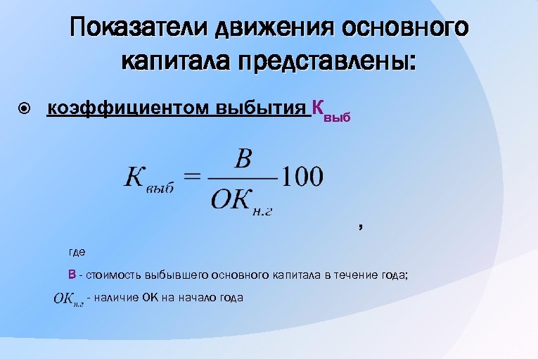 Показатели движения основного капитала представлены: коэффициентом выбытия Квыб , где В - стоимость выбывшего основного капитала в течение года; - наличие OK на начало года