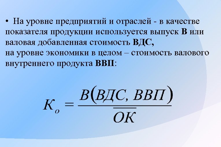 • На уровне предприятий и отраслей - в качестве показателя продукции используется выпуск В или валовая добавленная стоимость ВДС, на уровне экономики в целом – стоимость валового внутреннего продукта ВВП: