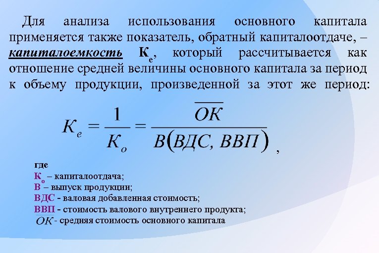 Для анализа использования основного капитала применяется также показатель, обратный капиталоотдаче, – капиталоемкость Ке, который рассчитывается как отношение средней величины основного капитала за период к объему продукции, произведенной за этот же период: , где Ко – капиталоотдача; В – выпуск продукции; ВДС - валовая добавленная стоимость; ВВП - стоимость валового внутреннего продукта; - средняя стоимость основного капитала