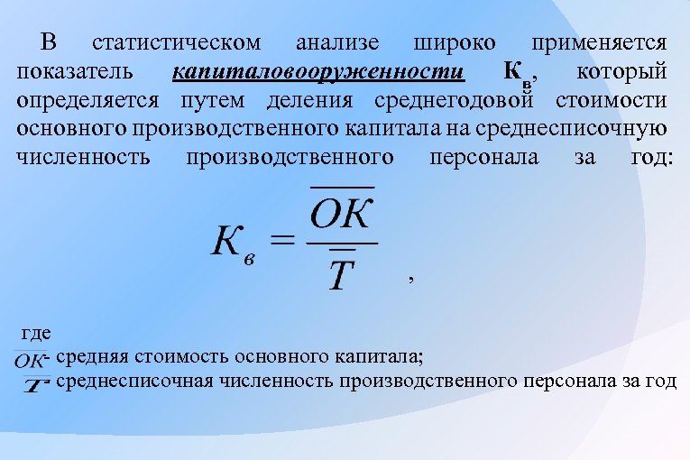 В статистическом анализе широко применяется показатель капиталовооруженности К в, который определяется путем деления среднегодовой стоимости основного производственного капитала на среднесписочную численность производственного персонала за год: , где - средняя стоимость основного капитала; - среднесписочная численность производственного персонала за год
