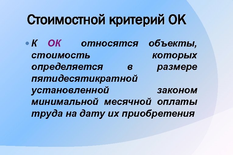 Стоимостной критерий ОК К ОК относятся объекты, стоимость которых определяется в размере пятидесятикратной установленной законом минимальной месячной оплаты труда на дату их приобретения