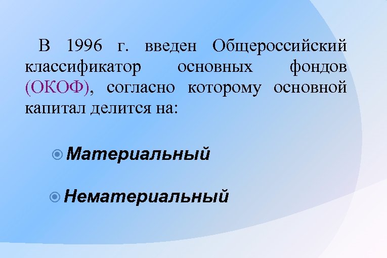 В 1996 г. введен Общероссийский классификатор основных фондов (ОКОФ), согласно которому основной капитал делится на: Материальный Нематериальный