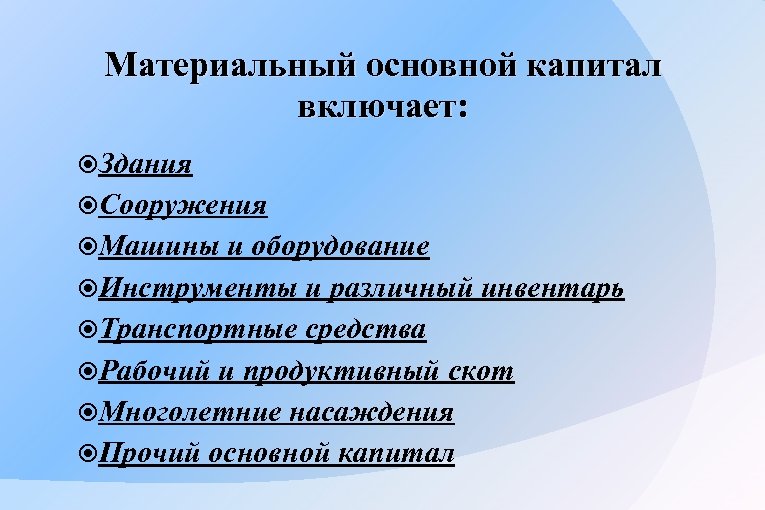 Материальный основной капитал включает: Здания Сооружения Машины и оборудование Инструменты и различный инвентарь Транспортные средства Рабочий и продуктивный скот Многолетние насаждения Прочий основной капитал
