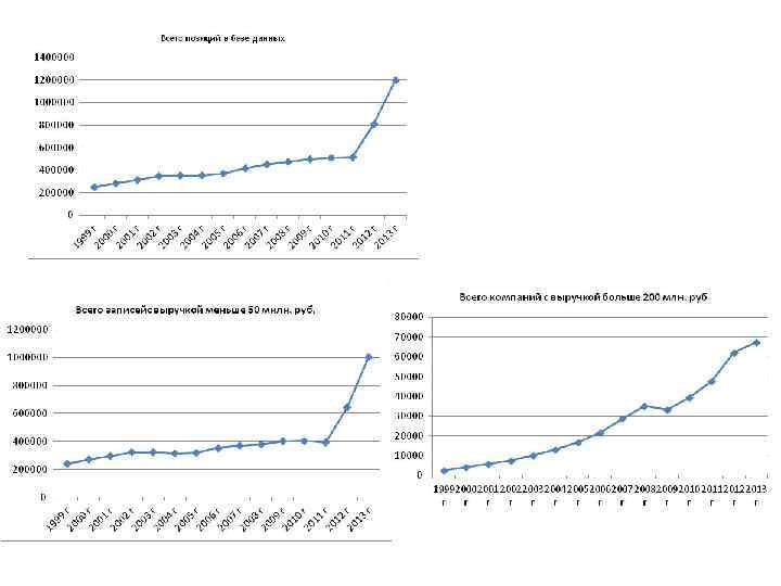 Эта часть анализа построена на основании базы данных, включающую информации о всех российских компаниях, имевших хоть раз за период с 1999 по 2012 годы выручку 200 и более миллионов рублей. Всего таких компаний чуть более 133 тысяч. База отражает как появление, так и исчезновение российских компаний, поэтому в ежегодном списке компаний, подающих отчетность, число компаний существенно меньше, чем в полной базе. Число компаний 90000 80000 70000 60000 50000 40000 30000 20000 10000 0 1999 г. 2000 г. 2001 г. 2002 г. 2003 г. 2004 г. 2005 г. 2006 г. 2007 г. 2008 г. 2009 г. 2010 г. 2011 г. 2012 г.