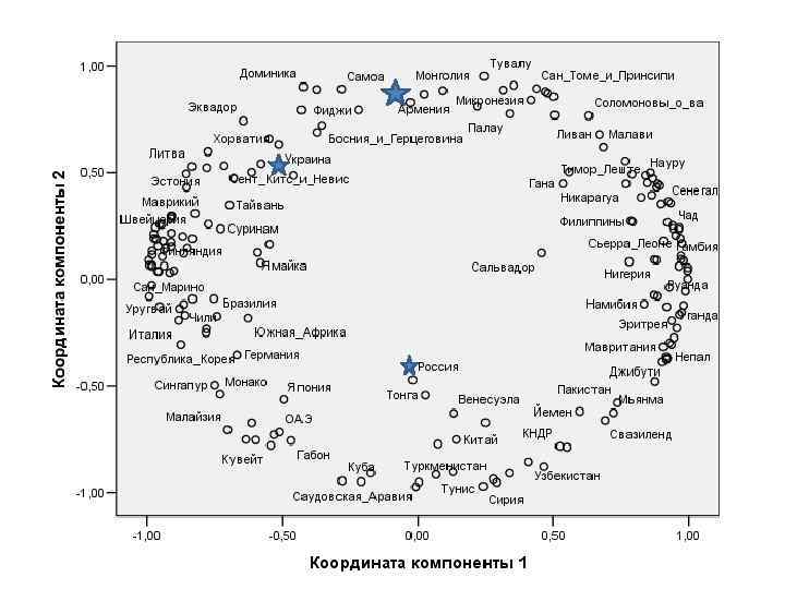 Страны из первоначального кластера Армении (при 40 кластерном разбиении). Сколько процентов особенностей страны объясняет каждый фактор. «Государственно сть» – vs. – «Угрозы» – vs. – «Государственно «качество сть» – vs. – жизни» «Потенциал жизни» «демократия» (проекция международного «человеческой влияния» (проекция национального государственного цены» (проекция государственност государственной выживания и его базиса Extraction и) качества) демократии) мощи) Армения 0, 0 75, 4 20, 7 3, 8 Македония Босния_и_Герц еговина Республика_Мо лдова 0, 1 68, 7 31, 1 0, 1 12, 6 52, 1 30, 8 4, 5 0, 7 81, 0 5, 0 13, 3