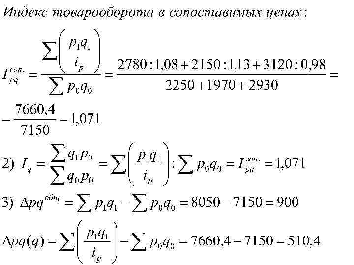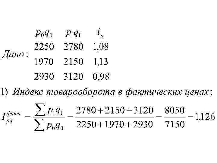 8. 4. Имеются следующие данные о товарообороте и ценах по трем группам товаров: Группа товаров 1 2 3 Розничный товарооборот в фактических ценах, тыс. руб. Изменение цен в отчетном периоде по сравнению с Базисный период Отчетный период базисным, % 2250 2780 + 8 1970 2930 2150 3120 + 13 - 2 Определите: 1) сводные индексы товарооборота в фактических и сопоставимых ценах; 2) сводный индекс физического объема товарооборота; 3) абсолютное изменение товарооборота, в том числе, вследствие изменения объемов реализации продукции в отчетном периоде по сравнению с базисным.