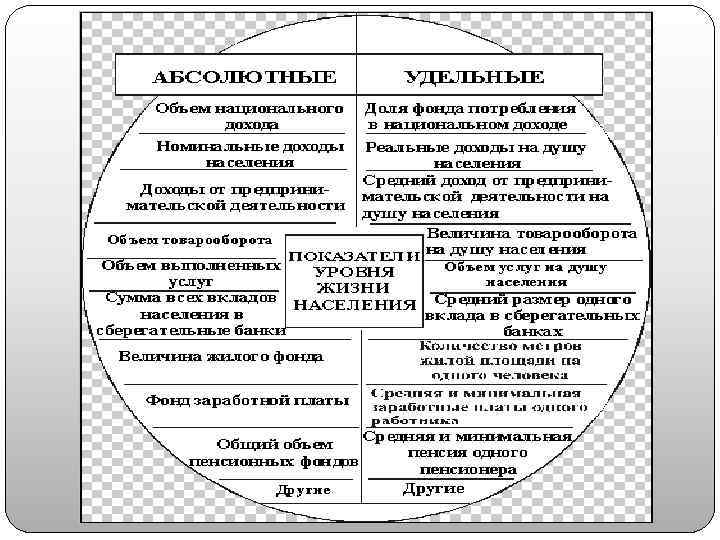Систему показателей уровня жизни населения можно разделить на три группы доходы потребление условия проживания На базе данных, характеризующих различные аспекты благосостояния населения, формируются основные социально-экономические индикаторы уровня жизни, которые выражаются через средние и медианные величины, темпы изменения, коэффициенты частоты, концентрации, дифференциации, а также покупательной способности.