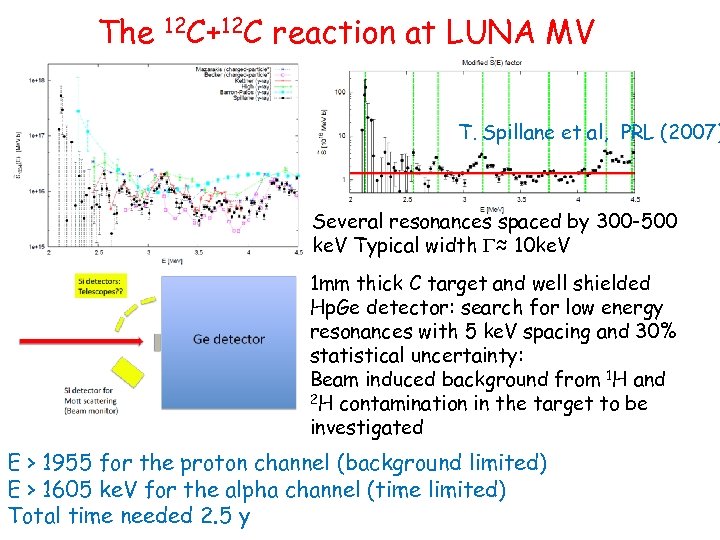 The 12 C+12 C reaction at LUNA MV T. Spillane et al, PRL (2007) Several resonances spaced by 300 -500 ke. V Typical width G≈ 10 ke. V 1 mm thick C target and well shielded Hp. Ge detector: search for low energy resonances with 5 ke. V spacing and 30% statistical uncertainty: Beam induced background from 1 H and 2 H contamination in the target to be investigated E > 1955 for the proton channel (background limited) E > 1605 ke. V for the alpha channel (time limited) Total time needed 2. 5 y