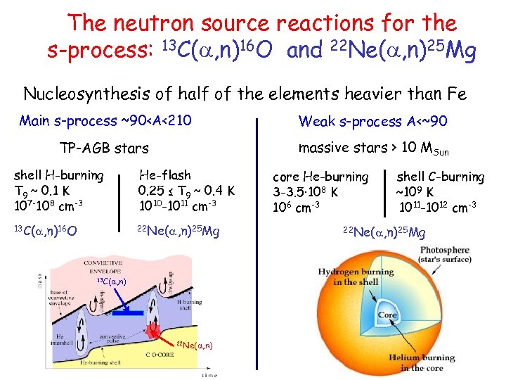 The neutron source reactions for the s-process: 13 C(a, n)16 O and 22 Ne(a, n)25 Mg Nucleosynthesis of half of the elements heavier than Fe Main s-process ~90 10 MSun shell H-burning T 9 ~ 0. 1 K 107 -108 cm-3 He-flash 0. 25 ≤ T 9 ~ 0. 4 K 1010 -1011 cm-3 13 C(a, n)16 O 22 Ne(a, n)25 Mg 13 C(a, n) 22 Ne(a, n) core He-burning 3 -3. 5· 108 K 106 cm-3 shell C-burning ~109 K 1011 -1012 cm-3 22 Ne(a, n)25 Mg
