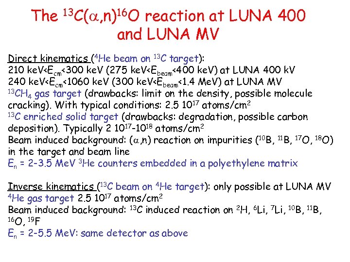 The 13 C(a, n)16 O reaction at LUNA 400 and LUNA MV Direct kinematics (4 He beam on 13 C target): 210 ke. V
