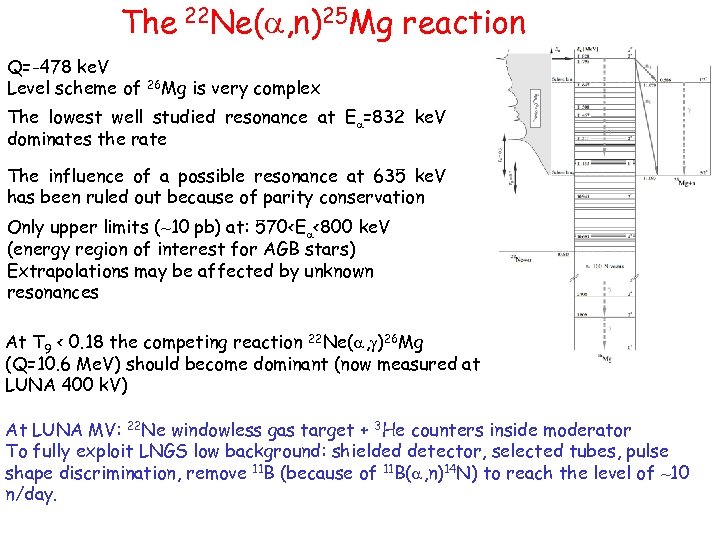 The 22 Ne(a, n)25 Mg reaction Q=-478 ke. V Level scheme of 26 Mg is very complex The lowest well studied resonance at Ea=832 ke. V dominates the rate The influence of a possible resonance at 635 ke. V has been ruled out because of parity conservation Only upper limits (~10 pb) at: 570