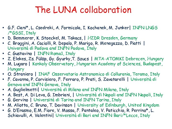 The LUNA collaboration • G. F. Ciani*, L. Csedreki, A. Formicola, I. Kochanek, M. Junker| INFN LNGS /*GSSI, Italy • D. Bemmerer, K. Stoeckel, M. Takacs, | HZDR Dresden, Germany • C. Broggini, A. Caciolli, R. Depalo, P. Marigo, R. Menegazzo, D. Piatti | Università di Padova and INFN Padova, Italy • C. Gustavino | INFN Roma 1, Italy • Z. Elekes, Zs. Fülöp, Gy. Gyurky, T. Szucs | MTA-ATOMKI Debrecen, Hungary • M. Lugaro | Konkoly Observatory, Hungarian Academy of Sciences, Budapest, Hungary • O. Straniero | INAF Osservatorio Astronomico di Collurania, Teramo, Italy • F. Cavanna, P. Corvisiero, F. Ferraro, P. Prati, S. Zavatarelli | Università di Genova and INFN Genova, Italy • A. Guglielmetti| Università di Milano and INFN Milano, Italy • A. Best, A. Di Leva, G. Imbriani, | Università di Napoli and INFN Napoli, Italy • G. Gervino | Università di Torino and INFN Torino, Italy • M. Aliotta, C. Bruno, T. Davinson | University of Edinburgh, United Kingdom • G. D’Erasmo, E. M. Fiore, V. Mossa, F. Pantaleo, V. Paticchio, R. Perrino*, L. Schiavulli, A. Valentini| Università di Bari and INFN Bari/*Lecce, Italy