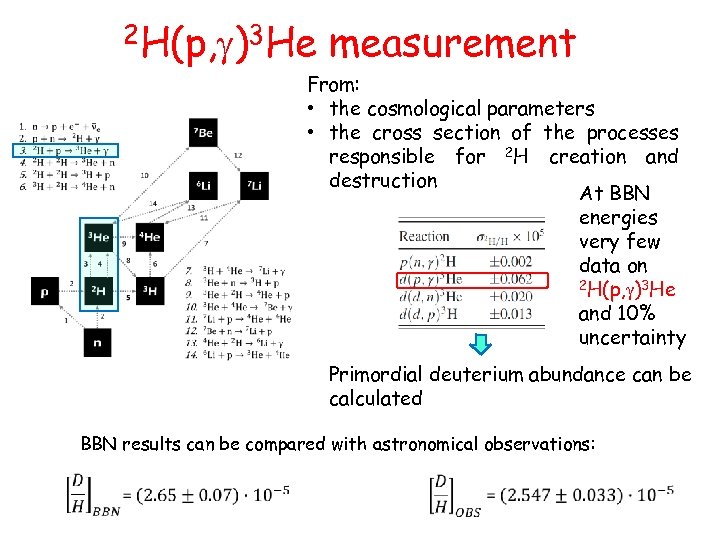 2 H(p, g)3 He measurement From: • the cosmological parameters • the cross section of the processes responsible for 2 H creation and destruction At BBN energies very few data on 2 H(p, g)3 He and 10% uncertainty Primordial deuterium abundance can be calculated BBN results can be compared with astronomical observations: