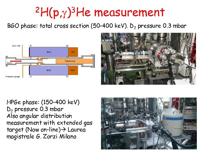 2 H(p, g)3 He measurement BGO phase: total cross section (50 -400 ke. V). D 2 pressure 0. 3 mbar HPGe phase: (150 -400 ke. V) D 2 pressure 0. 3 mbar Also angular distribution measurement with extended gas target (Now on-line) Laurea magistrale G. Zorzi Milano
