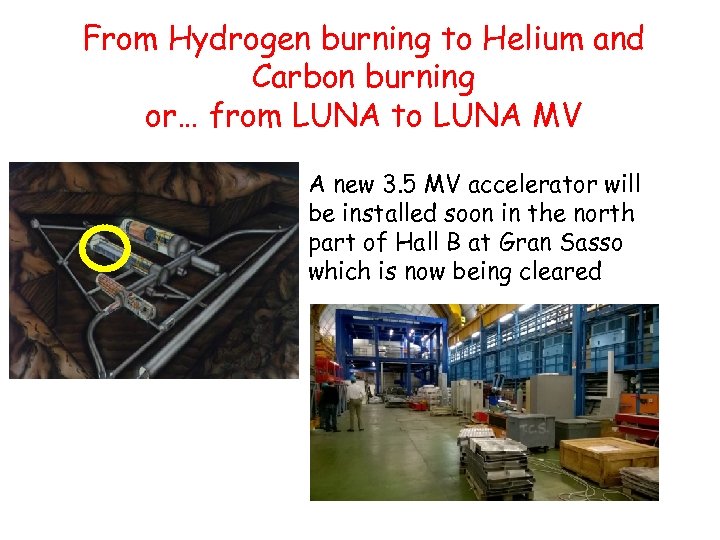 From Hydrogen burning to Helium and Carbon burning or… from LUNA to LUNA MV A new 3. 5 MV accelerator will be installed soon in the north part of Hall B at Gran Sasso which is now being cleared