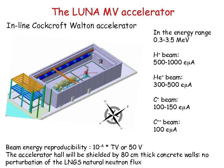 The LUNA MV accelerator In-line Cockcroft Walton accelerator In the energy range 0. 3 -3. 5 Me. V H+ beam: 500 -1000 em. A He+ beam: 300 -500 em. A C+ beam: 100 -150 em. A C++ beam: 100 em. A Beam energy reproducibility : 10 -4 * TV or 50 V The accelerator hall will be shielded by 80 cm thick concrete walls: no perturbation of the LNGS natural neutron flux