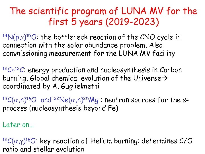 The scientific program of LUNA MV for the first 5 years (2019 -2023) 14 N(p, g)15 O: the bottleneck reaction of the CNO cycle in connection with the solar abundance problem. Also commissioning measurement for the LUNA MV facility 12 C+12 C: energy production and nucleosynthesis in Carbon burning. Global chemical evolution of the Universe coordinated by A. Guglielmetti 13 C(a, n)16 O and 22 Ne(a, n)25 Mg : neutron sources for the sprocess (nucleosynthesis beyond Fe) Later on… 12 C(a, g)16 O: key reaction of Helium burning: determines C/O ratio and stellar evolution