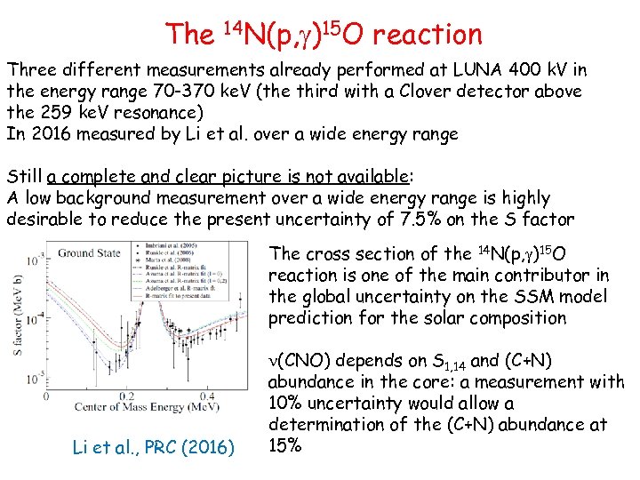 The 14 N(p, g)15 O reaction Three different measurements already performed at LUNA 400 k. V in the energy range 70 -370 ke. V (the third with a Clover detector above the 259 ke. V resonance) In 2016 measured by Li et al. over a wide energy range Still a complete and clear picture is not available: A low background measurement over a wide energy range is highly desirable to reduce the present uncertainty of 7. 5% on the S factor The cross section of the 14 N(p, g)15 O reaction is one of the main contributor in the global uncertainty on the SSM model prediction for the solar composition Li et al. , PRC (2016) n(CNO) depends on S 1, 14 and (C+N) abundance in the core: a measurement with 10% uncertainty would allow a determination of the (C+N) abundance at 15%