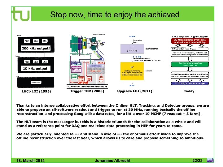 Is the TPU cost effective, TODAY ? Various estimates: (16/26)*2. 3+1. 5 = 2. 9 ms (%GEC) 60% * 3. 8 = 2. 3 ms 3. 8 ms -(VELO 10) = 2. 4 ms Cost of (naked) CPU: ~120 SWF/core → 1 ms@40 MHz = 4. 8 MCHF TPU equivalent: 10 ÷ 15 MCHF Timing of piece of code yielding the performances we have been comparing to: 3. 8 ms (standalone CPU-2012) It was later understood that this piece of code performs further extra work (backward VELO layers) We have no piece of code doing exactly the TPU work on the sample, TPU clearly cost-effective with the same performance solution at present time
