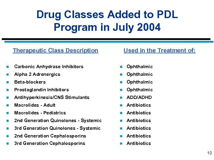 Drug Classes Added to PDL Program in April 2004 Therapeutic Class Description Used in The Treatment of: n Oral Hypoglycemics n Diabetes n Leukotriene Modifiers n Allergic Conditions/Asthma n Bisphonates n Osteoporosis n Traditional NSAIDs n Inflammatory Conditions n Serotonin Receptor Agonists n Migraine Headache n Oral Antifungals n Nail Fungal Infections 9