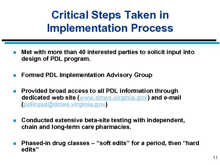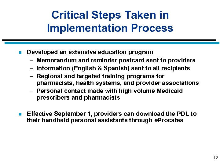 Critical Steps Taken in Implementation Process n Met with more than 40 interested parties to solicit input into design of PDL program. n Formed PDL Implementation Advisory Group n Provided broad access to all PDL information through dedicated web site (www. dmas. virginia. gov) and e-mail (pdlinput@dmas. virginia. gov) n Conducted extensive beta-site testing with independent, chain and long-term care pharmacies. n Phased-in drug classes – “soft edits” for a period, then “hard edits” 11