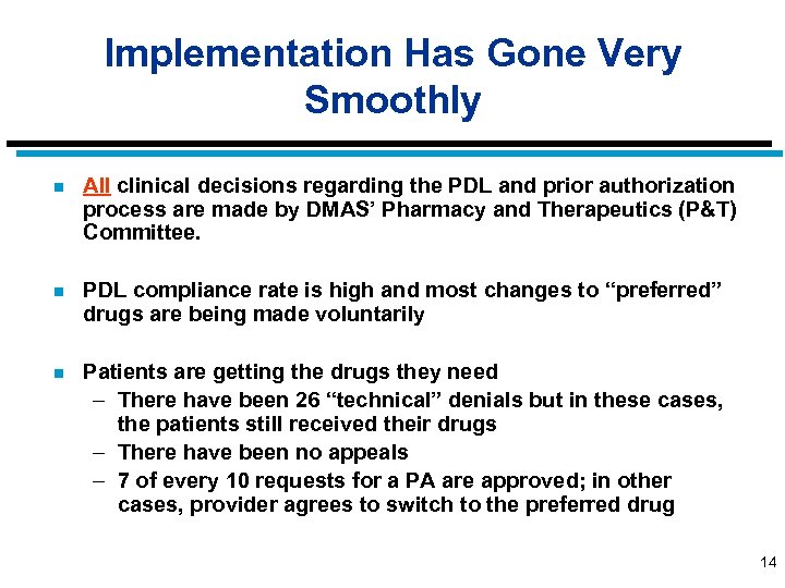 Critical Steps Taken in Implementation Process n Developed an extensive education program – Memorandum and reminder postcard sent to providers – Information (English & Spanish) sent to all recipients – Regional and targeted training programs for pharmacists, health systems, and provider associations – Personal contact made with high volume Medicaid prescribers and pharmacists n Effective September 1, providers can download the PDL to their handheld personal assistants through e. Procates 12