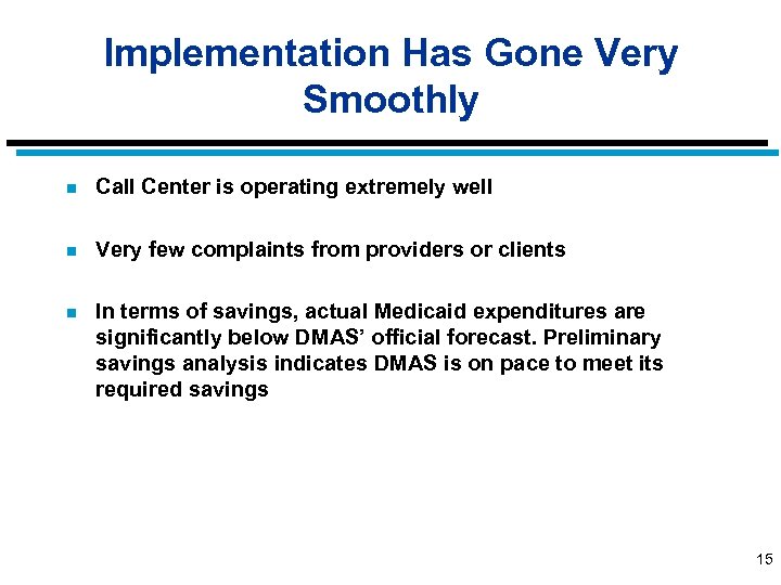 Implementation Has Gone Very Smoothly n All clinical decisions regarding the PDL and prior authorization process are made by DMAS’ Pharmacy and Therapeutics (P&T) Committee. n PDL compliance rate is high and most changes to “preferred” drugs are being made voluntarily n Patients are getting the drugs they need – There have been 26 “technical” denials but in these cases, the patients still received their drugs – There have been no appeals – 7 of every 10 requests for a PA are approved; in other cases, provider agrees to switch to the preferred drug 14