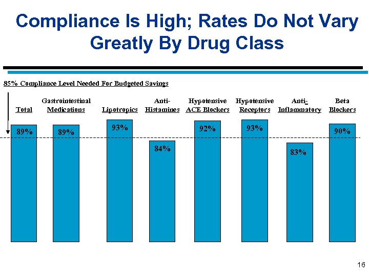 Compliance Is High; Rates Do Not Vary Greatly By Drug Class 85% Compliance Level Needed For Budgeted Savings Total Gastrointestinal Medications 89% Lipotropics Anti. Hypotensive Anti. Histamines ACE Blockers Receptors Inflammatory 93% 92% 84% 93% Beta Blockers 90% 83% 16