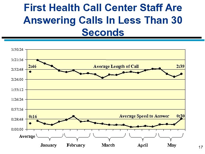 First Health Call Center Staff Are Answering Calls In Less Than 30 Seconds 3: 50: 24 3: 21: 36 2: 52: 48 2: 46 Average Length of Call 2: 39 2: 24: 00 1: 55: 12 1: 26: 24 0: 57: 36 0: 28: 48 Average Speed to Answer 0: 16 0: 30 0: 00 Average January February March April May 17
