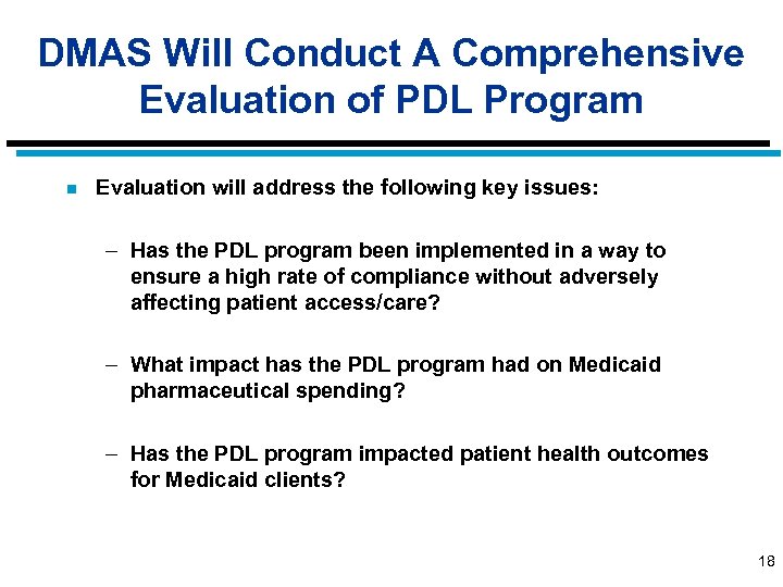 DMAS Will Conduct A Comprehensive Evaluation of PDL Program n Evaluation will address the following key issues: – Has the PDL program been implemented in a way to ensure a high rate of compliance without adversely affecting patient access/care? – What impact has the PDL program had on Medicaid pharmaceutical spending? – Has the PDL program impacted patient health outcomes for Medicaid clients? 18