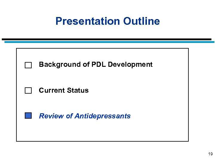 Presentation Outline Background of PDL Development Current Status Review of Antidepressants 19