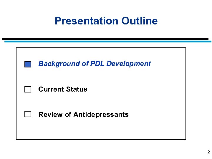 Presentation Outline Background of PDL Development Current Status Review of Antidepressants 2