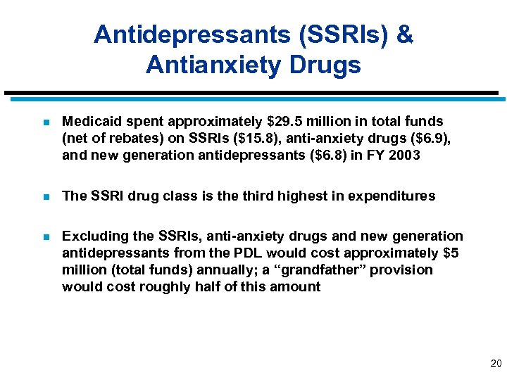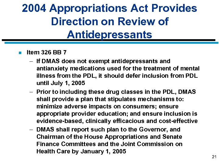 Antidepressants (SSRIs) & Antianxiety Drugs n Medicaid spent approximately $29. 5 million in total funds (net of rebates) on SSRIs ($15. 8), anti-anxiety drugs ($6. 9), and new generation antidepressants ($6. 8) in FY 2003 n The SSRI drug class is the third highest in expenditures n Excluding the SSRIs, anti-anxiety drugs and new generation antidepressants from the PDL would cost approximately $5 million (total funds) annually; a “grandfather” provision would cost roughly half of this amount 20