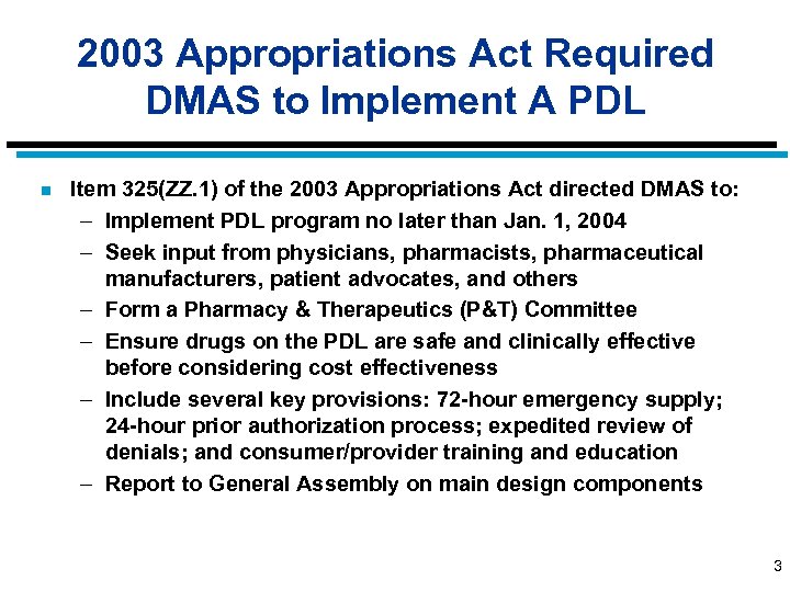 2003 Appropriations Act Required DMAS to Implement A PDL n Item 325(ZZ. 1) of the 2003 Appropriations Act directed DMAS to: – Implement PDL program no later than Jan. 1, 2004 – Seek input from physicians, pharmacists, pharmaceutical manufacturers, patient advocates, and others – Form a Pharmacy & Therapeutics (P&T) Committee – Ensure drugs on the PDL are safe and clinically effective before considering cost effectiveness – Include several key provisions: 72 -hour emergency supply; 24 -hour prior authorization process; expedited review of denials; and consumer/provider training and education – Report to General Assembly on main design components 3