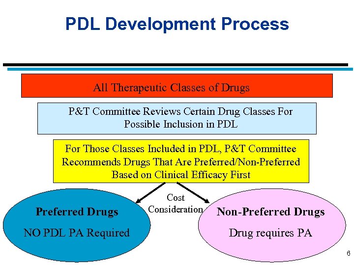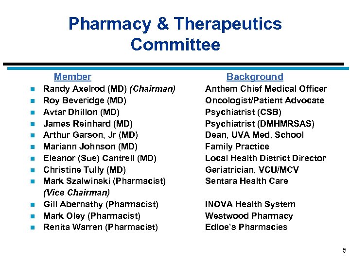 Pharmacy & Therapeutics Committee Member n n n Randy Axelrod (MD) (Chairman) Roy Beveridge (MD) Avtar Dhillon (MD) James Reinhard (MD) Arthur Garson, Jr (MD) Mariann Johnson (MD) Eleanor (Sue) Cantrell (MD) Christine Tully (MD) Mark Szalwinski (Pharmacist) (Vice Chairman) Gill Abernathy (Pharmacist) Mark Oley (Pharmacist) Renita Warren (Pharmacist) Background Anthem Chief Medical Officer Oncologist/Patient Advocate Psychiatrist (CSB) Psychiatrist (DMHMRSAS) Dean, UVA Med. School Family Practice Local Health District Director Geriatrician, VCU/MCV Sentara Health Care INOVA Health System Westwood Pharmacy Edloe’s Pharmacies 5