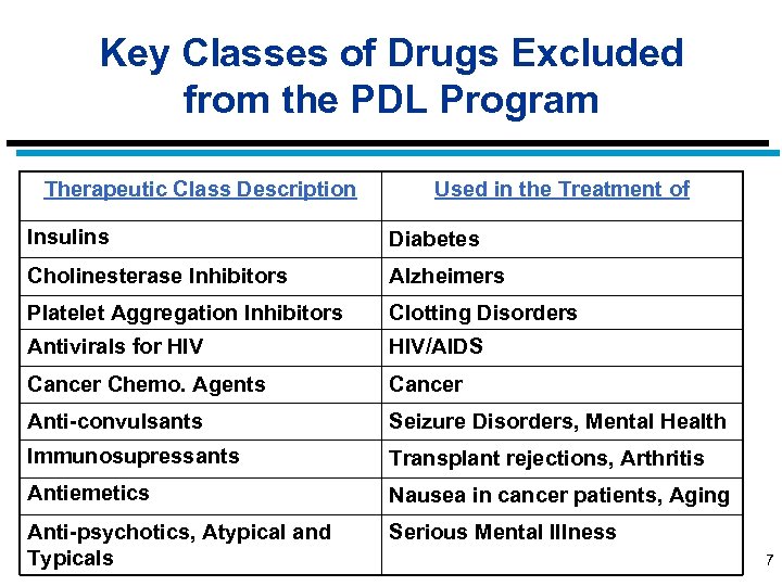 PDL Development Process All Therapeutic Classes of Drugs P&T Committee Reviews Certain Drug Classes For Possible Inclusion in PDL For Those Classes Included in PDL, P&T Committee Recommends Drugs That Are Preferred/Non-Preferred Based on Clinical Efficacy First Preferred Drugs NO PDL PA Required Cost Consideration Non-Preferred Drugs Drug requires PA 6