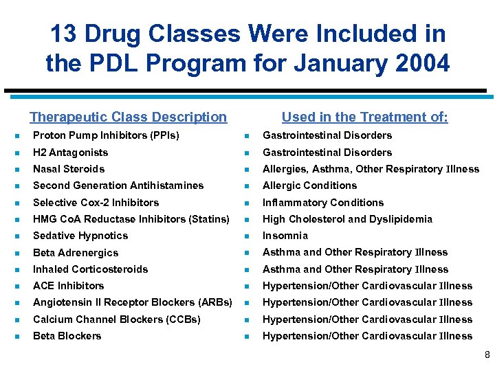 Key Classes of Drugs Excluded from the PDL Program Therapeutic Class Description Used in the Treatment of Insulins Diabetes Cholinesterase Inhibitors Alzheimers Platelet Aggregation Inhibitors Clotting Disorders Antivirals for HIV/AIDS Cancer Chemo. Agents Cancer Anti-convulsants Seizure Disorders, Mental Health Immunosupressants Transplant rejections, Arthritis Antiemetics Nausea in cancer patients, Aging Anti-psychotics, Atypical and Typicals Serious Mental Illness 7