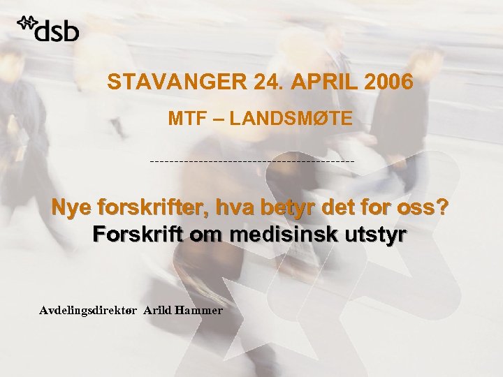 STAVANGER 24. APRIL 2006 MTF – LANDSMØTE Nye forskrifter, hva betyr det for oss? Forskrift om medisinsk utstyr Avdelingsdirektør Arild Hammer