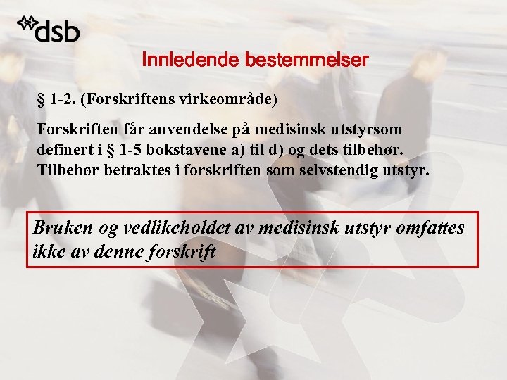 Innledende bestemmelser § 1 -2. (Forskriftens virkeområde) Forskriften får anvendelse på medisinsk utstyrsom definert i § 1 -5 bokstavene a) til d) og dets tilbehør. Tilbehør betraktes i forskriften som selvstendig utstyr. Bruken og vedlikeholdet av medisinsk utstyr omfattes ikke av denne forskrift