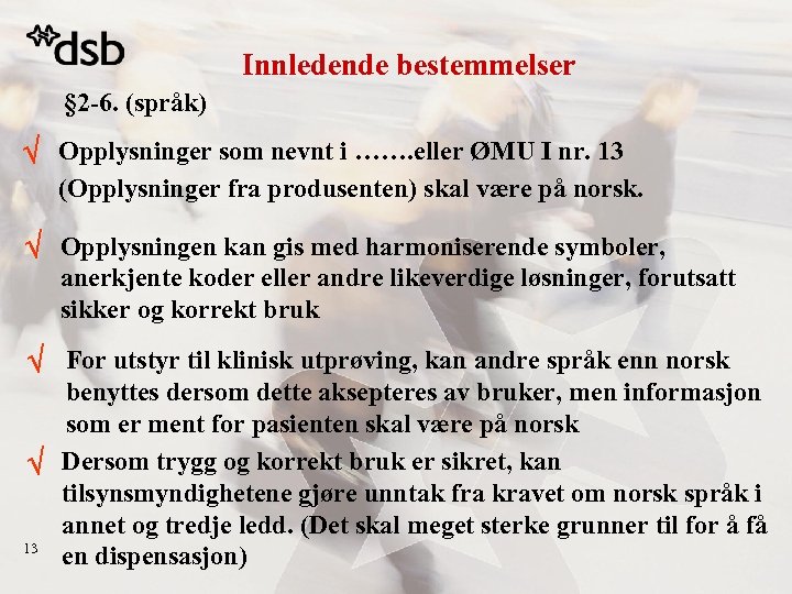 Innledende bestemmelser § 2 -6. (språk) Opplysninger som nevnt i ……. eller ØMU I nr. 13 (Opplysninger fra produsenten) skal være på norsk. Opplysningen kan gis med harmoniserende symboler, anerkjente koder eller andre likeverdige løsninger, forutsatt sikker og korrekt bruk For utstyr til klinisk utprøving, kan andre språk enn norsk benyttes dersom dette aksepteres av bruker, men informasjon som er ment for pasienten skal være på norsk Dersom trygg og korrekt bruk er sikret, kan tilsynsmyndighetene gjøre unntak fra kravet om norsk språk i annet og tredje ledd. (Det skal meget sterke grunner til for å få 13 en dispensasjon)