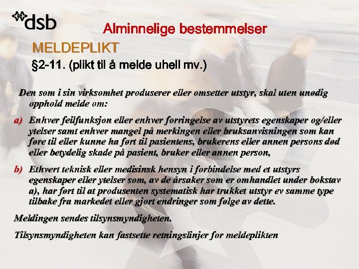 Alminnelige bestemmelser MELDEPLIKT § 2 -11. (plikt til å melde uhell mv. ) Den som i sin virksomhet produserer eller omsetter utstyr, skal uten unødig opphold melde om: a) Enhver feilfunksjon eller enhver forringelse av utstyrets egenskaper og/eller ytelser samt enhver mangel på merkingen eller bruksanvisningen som kan føre til eller kunne ha ført til pasientens, brukerens eller annen persons død eller betydelig skade på pasient, bruker eller annen person, b) Ethvert teknisk eller medisinsk hensyn i forbindelse med et utstyrs egenskaper eller ytelser som, av de årsaker som er omhandlet under bokstav a), har ført til at produsenten systematisk har trukket utstyr ev samme type tilbake fra markedet eller gjort endringer som følge av dette. Meldingen sendes tilsynsmyndigheten. Tilsynsmyndigheten kan fastsette retningslinjer for meldeplikten