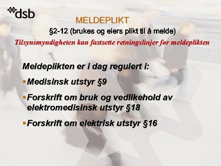 MELDEPLIKT § 2 -12 (brukes og eiers plikt til å melde) Tilsynsmyndigheten kan fastsette retningslinjer for meldeplikten Meldeplikten er i dag regulert i: § Medisinsk utstyr § 9 § Forskrift om bruk og vedlikehold av elektromedisinsk utstyr § 18 § Forskrift om elektrisk utstyr § 16