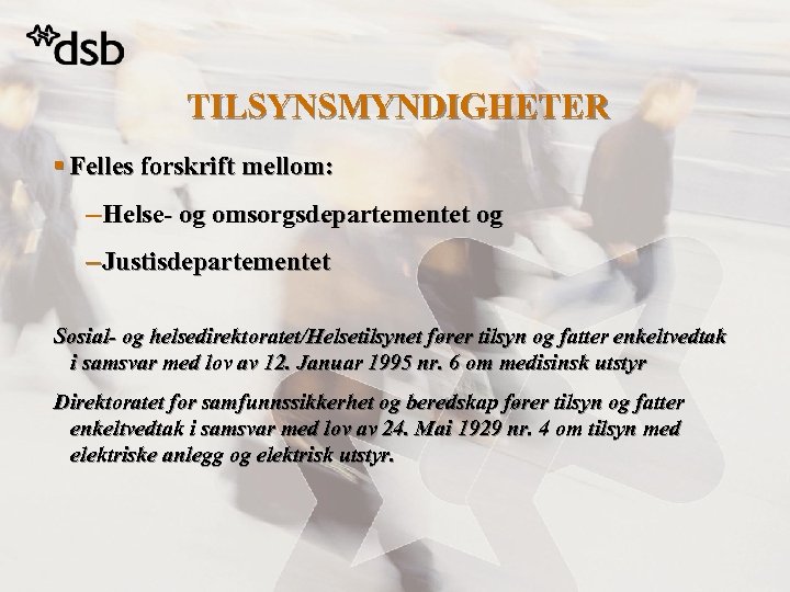 TILSYNSMYNDIGHETER § Felles forskrift mellom: – Helse- og omsorgsdepartementet og – Justisdepartementet Sosial- og helsedirektoratet/Helsetilsynet fører tilsyn og fatter enkeltvedtak i samsvar med lov av 12. Januar 1995 nr. 6 om medisinsk utstyr Direktoratet for samfunnssikkerhet og beredskap fører tilsyn og fatter enkeltvedtak i samsvar med lov av 24. Mai 1929 nr. 4 om tilsyn med elektriske anlegg og elektrisk utstyr.