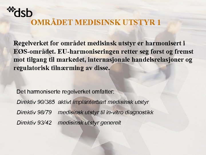 OMRÅDET MEDISINSK UTSTYR 1 Regelverket for området medisinsk utstyr er harmonisert i EØS-området. EU-harmoniseringen retter seg først og fremst mot tilgang til markedet, internasjonale handelsrelasjoner og regulatorisk tilnærming av disse. Det harmoniserte regelverket omfatter: Direktiv 90/385 aktivt implanterbart medisinsk utstyr Direktiv 98/79 medisinsk utstyr til in-vitro diagnostikk Direktiv 93/42 medisinsk utstyr generelt