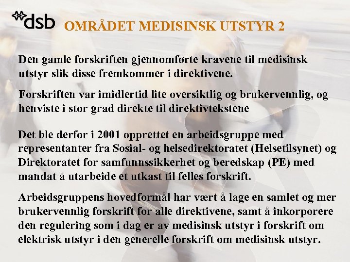 OMRÅDET MEDISINSK UTSTYR 2 Den gamle forskriften gjennomførte kravene til medisinsk utstyr slik disse fremkommer i direktivene. Forskriften var imidlertid lite oversiktlig og brukervennlig, og henviste i stor grad direkte til direktivtekstene Det ble derfor i 2001 opprettet en arbeidsgruppe med representanter fra Sosial- og helsedirektoratet (Helsetilsynet) og Direktoratet for samfunnssikkerhet og beredskap (PE) med mandat å utarbeide et utkast til felles forskrift. Arbeidsgruppens hovedformål har vært å lage en samlet og mer brukervennlig forskrift for alle direktivene, samt å inkorporere den regulering som i dag er av medisinsk utstyr i forskrift om elektrisk utstyr i den generelle forskrift om medisinsk utstyr.