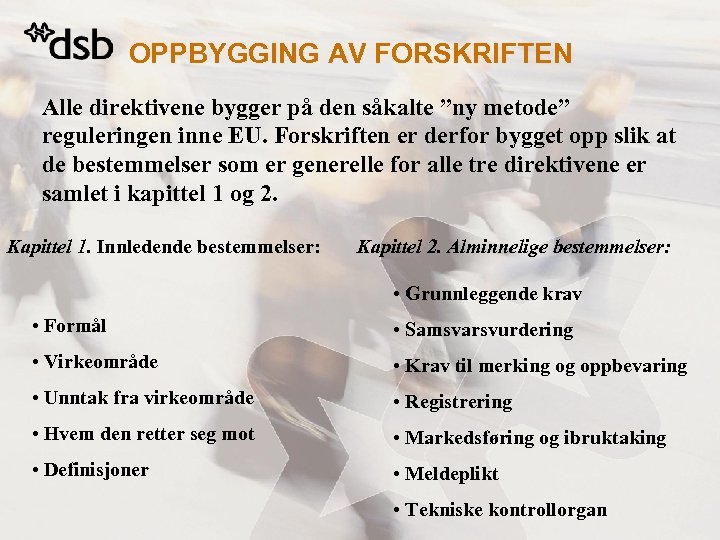 OPPBYGGING AV FORSKRIFTEN Alle direktivene bygger på den såkalte ”ny metode” reguleringen inne EU. Forskriften er derfor bygget opp slik at de bestemmelser som er generelle for alle tre direktivene er samlet i kapittel 1 og 2. Kapittel 1. Innledende bestemmelser: Kapittel 2. Alminnelige bestemmelser: • Grunnleggende krav • Formål • Samsvarsvurdering • Virkeområde • Krav til merking og oppbevaring • Unntak fra virkeområde • Registrering • Hvem den retter seg mot • Markedsføring og ibruktaking • Definisjoner • Meldeplikt • Tekniske kontrollorgan