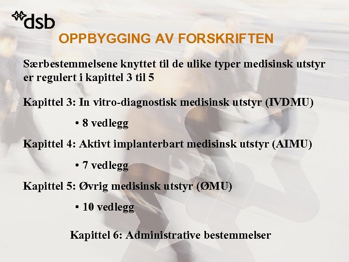 OPPBYGGING AV FORSKRIFTEN Særbestemmelsene knyttet til de ulike typer medisinsk utstyr er regulert i kapittel 3 til 5 Kapittel 3: In vitro-diagnostisk medisinsk utstyr (IVDMU) • 8 vedlegg Kapittel 4: Aktivt implanterbart medisinsk utstyr (AIMU) • 7 vedlegg Kapittel 5: Øvrig medisinsk utstyr (ØMU) • 10 vedlegg Kapittel 6: Administrative bestemmelser