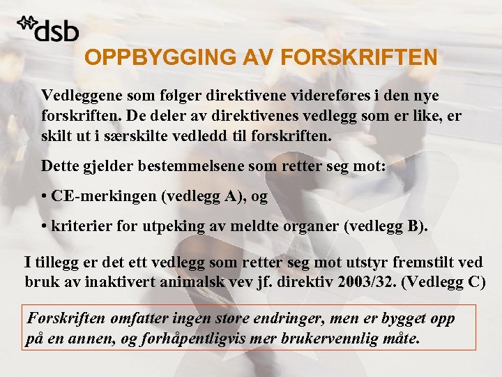 OPPBYGGING AV FORSKRIFTEN Vedleggene som følger direktivene videreføres i den nye forskriften. De deler av direktivenes vedlegg som er like, er skilt ut i særskilte vedledd til forskriften. Dette gjelder bestemmelsene som retter seg mot: • CE-merkingen (vedlegg A), og • kriterier for utpeking av meldte organer (vedlegg B). I tillegg er det ett vedlegg som retter seg mot utstyr fremstilt ved bruk av inaktivert animalsk vev jf. direktiv 2003/32. (Vedlegg C) Forskriften omfatter ingen store endringer, men er bygget opp på en annen, og forhåpentligvis mer brukervennlig måte.