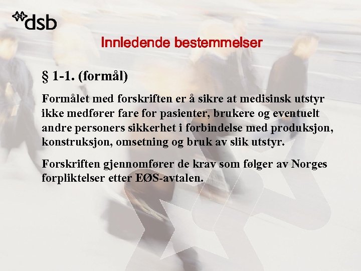 Innledende bestemmelser § 1 -1. (formål) Formålet med forskriften er å sikre at medisinsk utstyr ikke medfører fare for pasienter, brukere og eventuelt andre personers sikkerhet i forbindelse med produksjon, konstruksjon, omsetning og bruk av slik utstyr. Forskriften gjennomfører de krav som følger av Norges forpliktelser etter EØS-avtalen.
