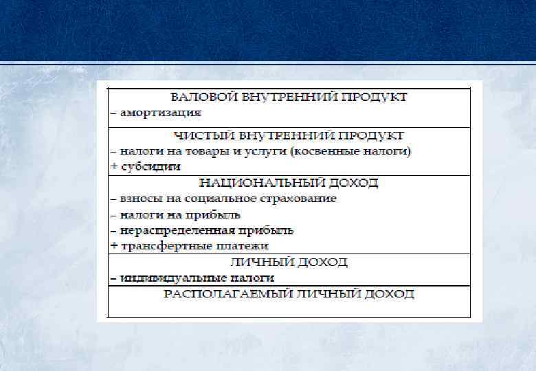 Валовый внутренний продукт (ВВП) — обобщающий экономический показатель, который в рыночных ценах выражает совокупную стоимость товаров и услуг, произведенных в стране во всех отраслях экономики и предназначенных для конечного потребления, накопления и чистого экспорта. Чистый внутренний продукт (ЧВП) измеряется вычитанием из ВВП амортизационных отчислений, т. е. стоимости инвестиционных товаров, остающихся в сфере производства. ЧВП характеризует величину стоимости ВВП, идущей на потребление населения и на частные инвестиции: ЧВП = ВВП-А. Валовый национальный продукт (ВНП) характеризует стоимость конечных товаров и услуг, созданных не только внутри страны, но и за ее пределами, т. е. созданных с помощью ресурсов, принадлежащих данной стране, независимо от их географического использования. Валовой национальный продукт рассчитывается так же, как валовой внутренний продукт, но отличается от него на величину, равную разнице между экспортом и импортом.